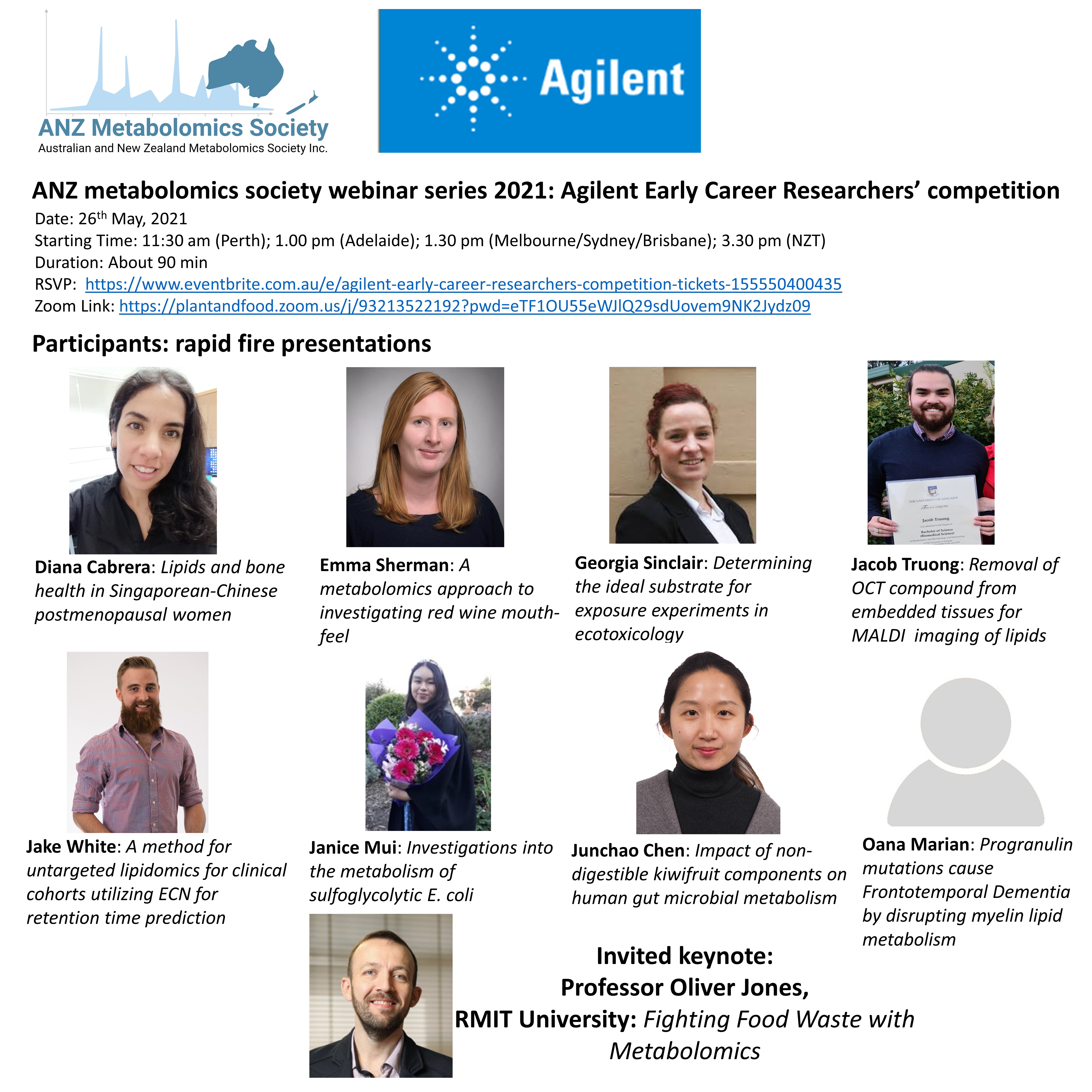 It is our pleasure to invite you to join our upcoming event supported by Agilent technologies. We have 8 participants who will showcase their research in 5 min with 3 slides. In addition to this data blitz, we have invited Professor Oliver Jones to present a keynote. See attached flyer and below for more details: